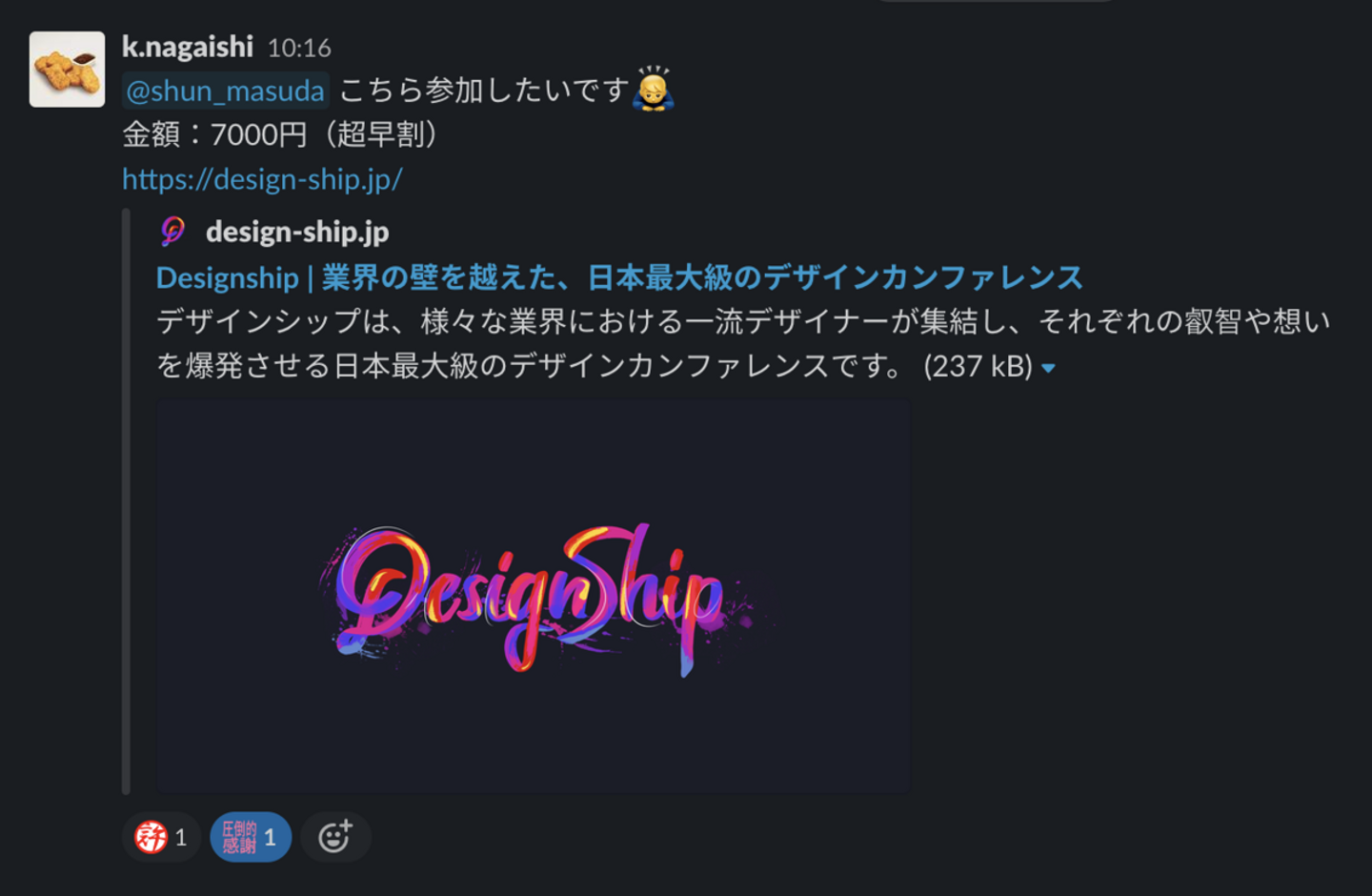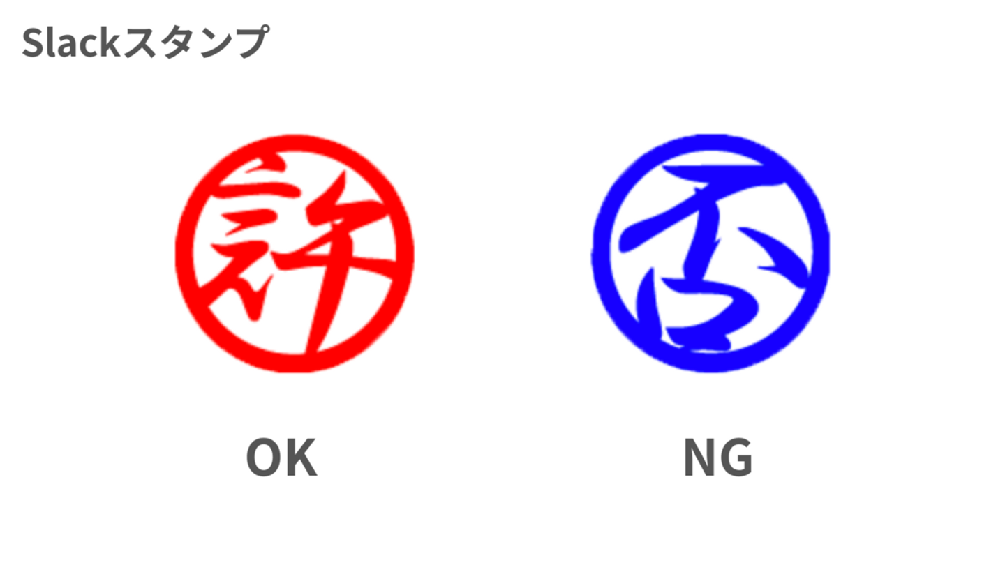 一応、定められた申請フローはありますが、めちゃくちゃ簡単です。 購入したい書籍や、参加したいイベントがあれば、Slackで「こちら参加(購入)したいです」とURLを添えて投稿するだけ。 投稿に対しマネージャーから「許」のスタンプがつけばOK、「否」のスタンプがつけばダメです。
