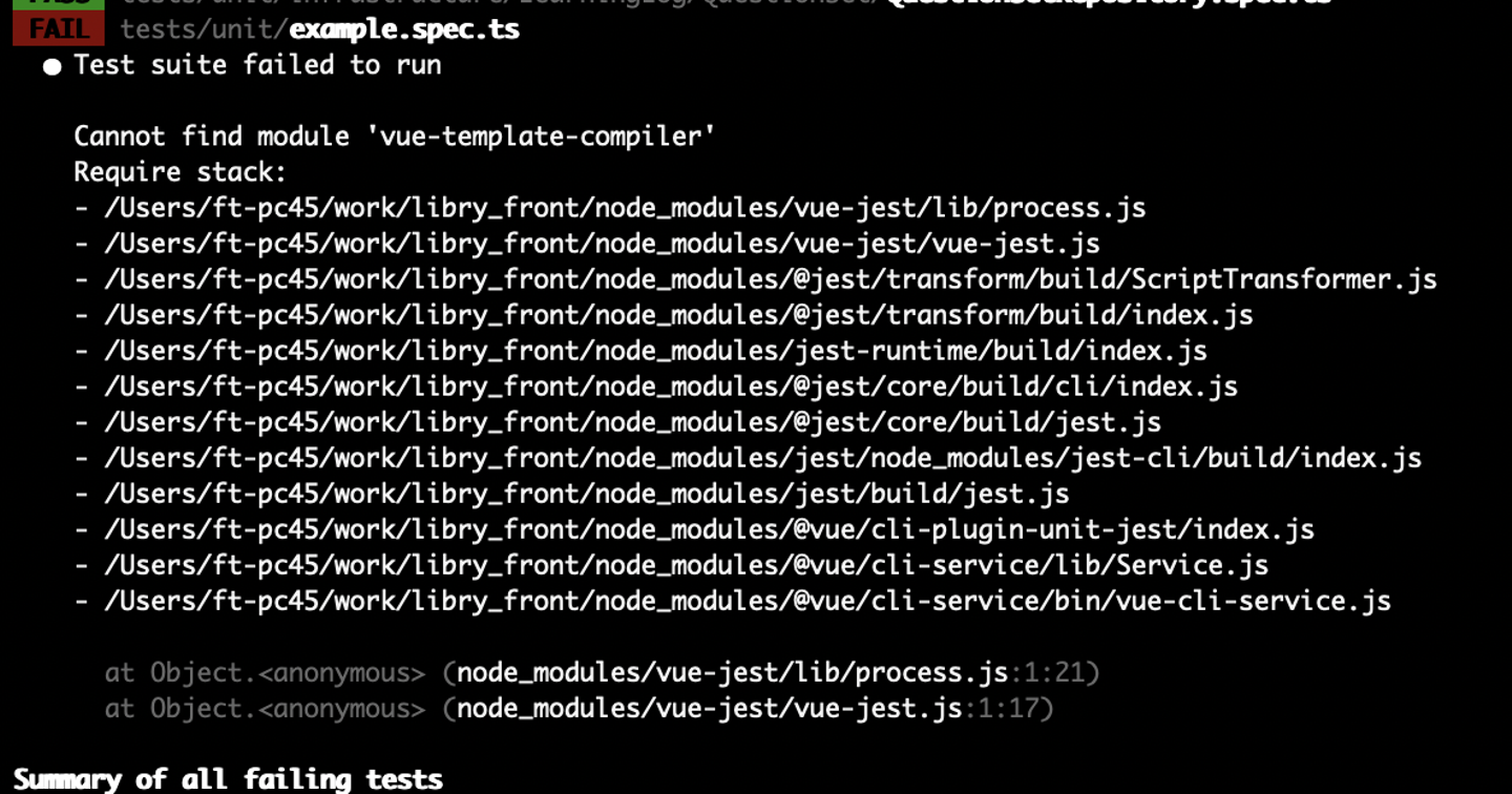 これがなかなか分からず、先輩エンジニアに助けてもらいました。。 下記ファイルを変更して、"vue-jest": "^5.0.0-0"を導入すると簡単に直りました。 エラー部分を断片的に見てしまっていたため、unit-testの設定がおかしいことに気づかなかったことに関しては、 まだまだだなと思います。