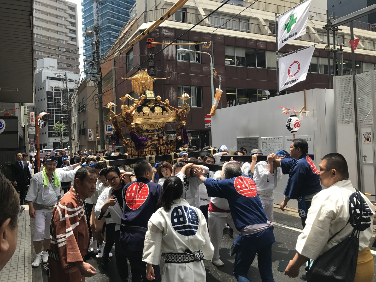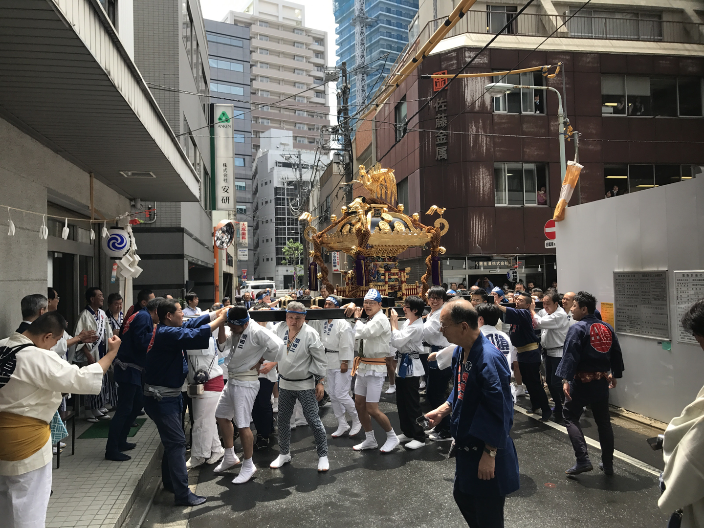 弊社ビルから徒歩30秒ほどのところに柳森神社があり、本日はそこへの宮入として町内の神輿巡行がありましたので、弊社社員も神輿を担ぎました。
