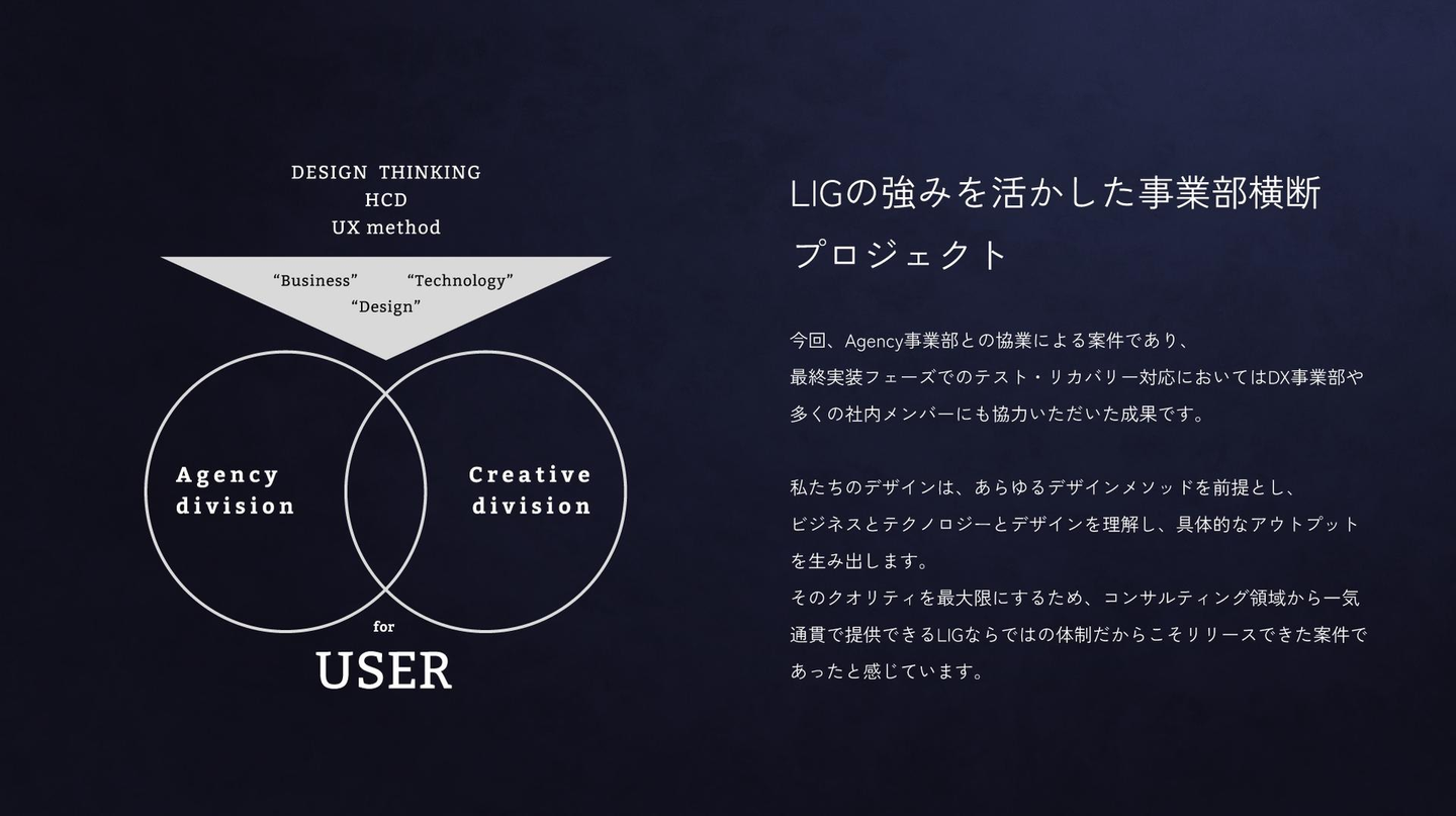 本プロジェクトは、LIGの複数事業部が連携した案件でもあります。Creative事業部が主導し、Agency事業部やDX事業部と協力しながら、デザインリサーチから実装・リカバリー対応に至るまでを一気通貫で支援しました!