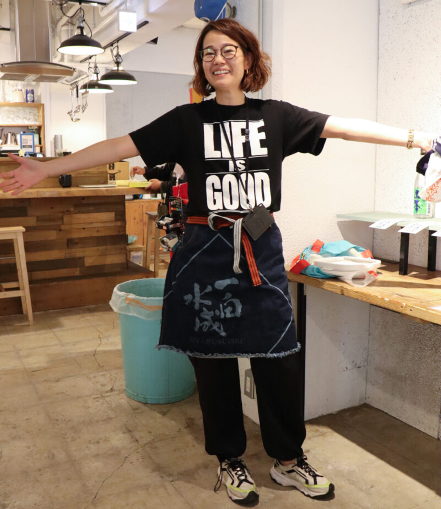 居酒屋店員風の衣装を身に着けた、デザイナーのまっつーさんです。キックオフ運営メンバーとして、当日のドリンク手配を担当してくれました。