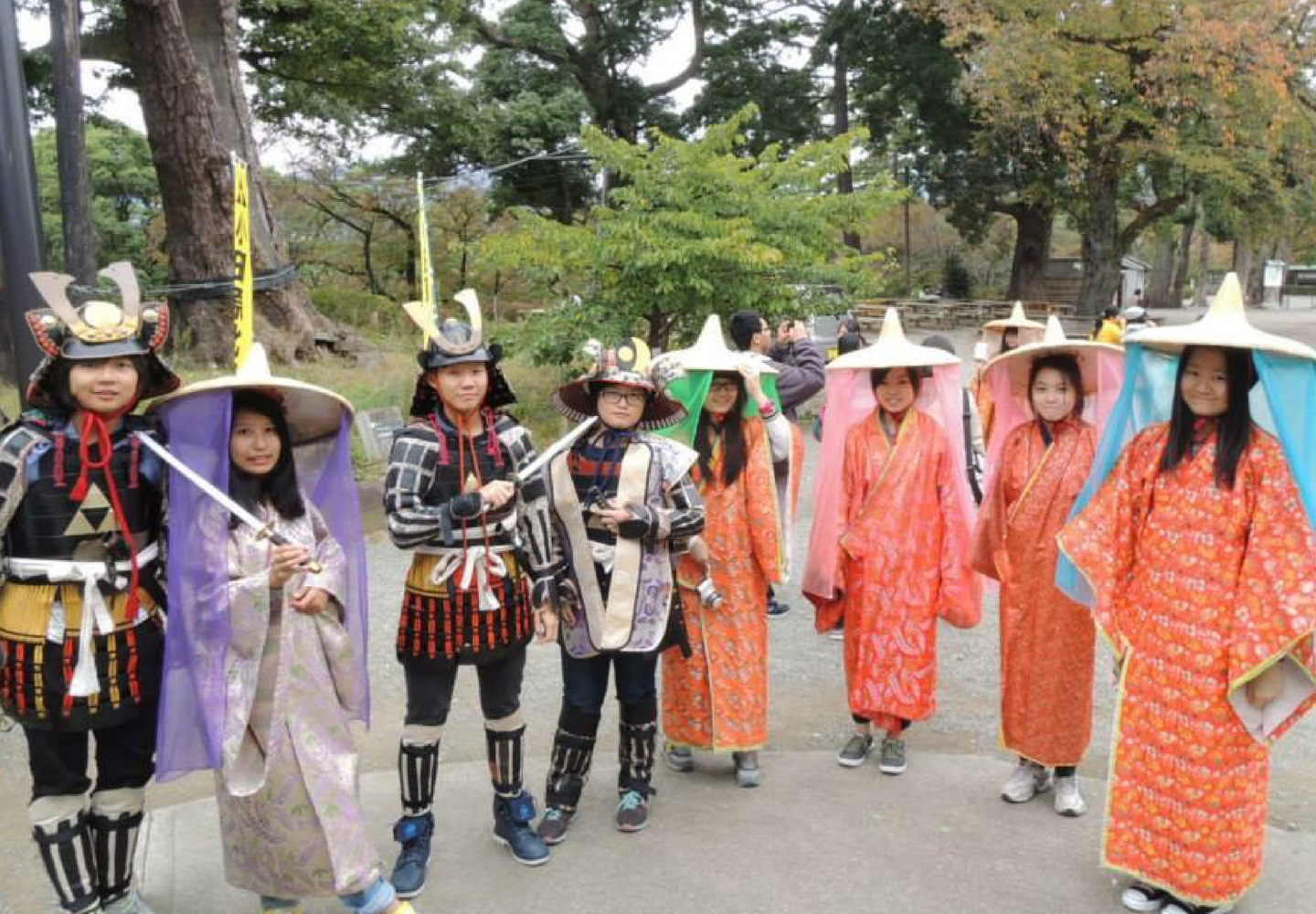 高校時代に日本の学校へ交流する際に、サムライへ変身した私(左から三番目)