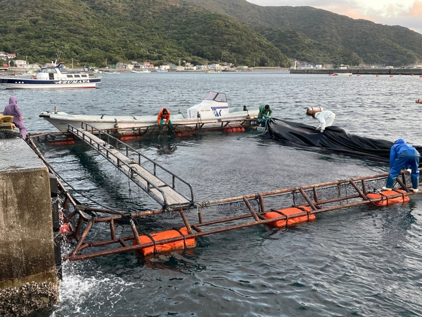 ドローンボートを使えば、養殖漁業や定置網の網の状況を陸にいながらリアルタイムで確認することができます。