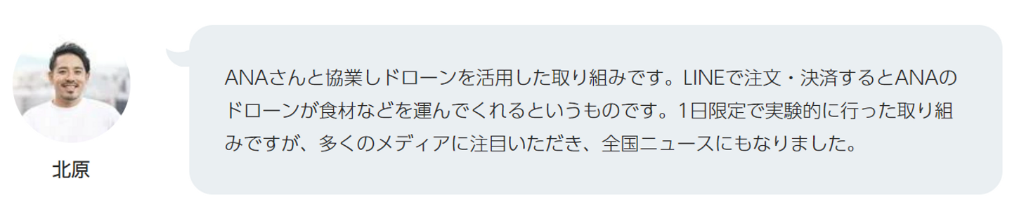 8月1日、ANAHDとLINEは「離島でとれた新鮮な海産物をドローンによって本島へ届け、本島のBBQ場で提供する」という実証実験を行いました。 本記事では ① ANAHDとLINEが提供したサービス内容 ② ANAHDとLINEはどのような目的で実証実験を行ったのか? ③ なぜANAHDはLINEと協業したのか? ④ LINEと民間企業の協業 についてご紹介いたします。 動画はこちら ...