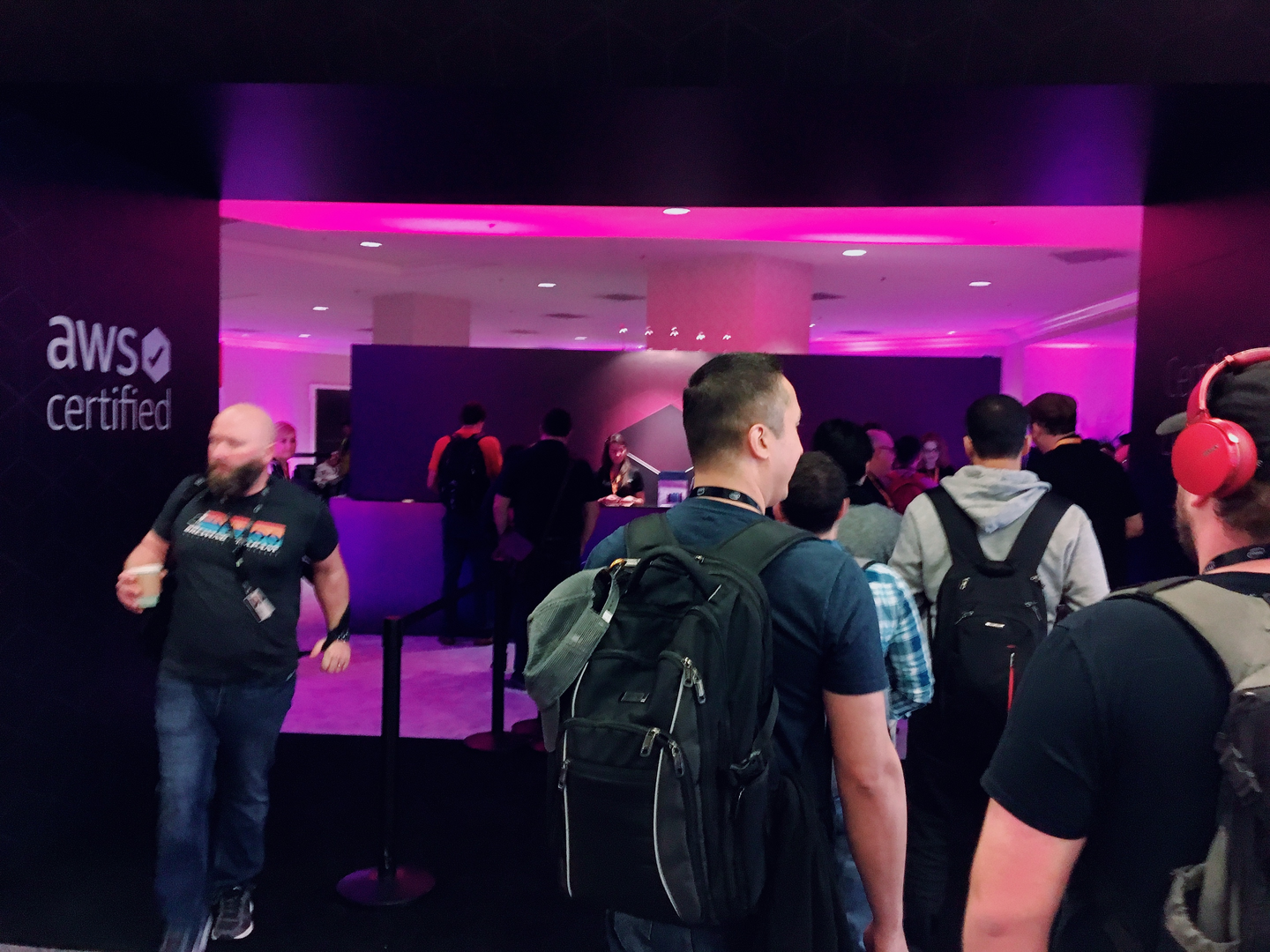 本日は AWS Certificate Lounge というAWS認定資格所有者しか入ることが許されないラウンジがあり、どうしても入りたかったので、AWS Cloud Practitioner という資格の受験しました。朝8時から試験を行い、9時に終わり結果は合格。その後すぐラウンジに向かったら資格所有者ということで入場できました。ここではTシャツ・ボトル・バッチを頂きました。混み合っていますが、充電器などは充実しており空いた時間に活用しようと思います。