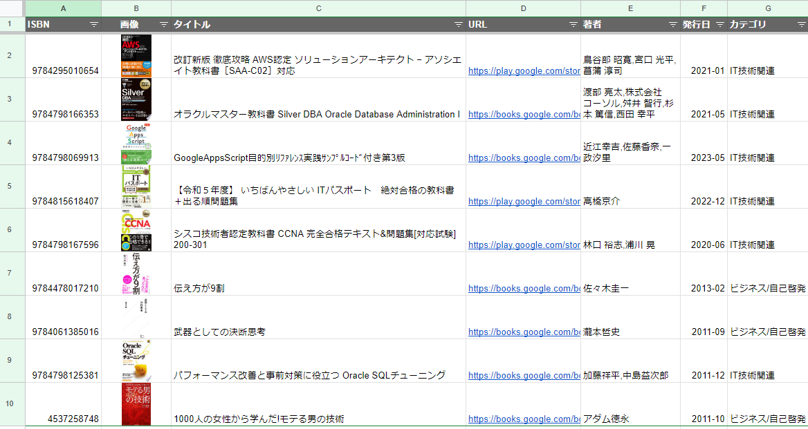 A列のISBN番号を入力すると、サムネイル/タイトル/URL/著者/発行日が自動で入力されます。