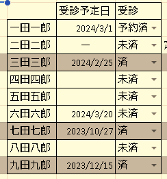 今回は健康診断の受診状況一覧と仮定して、以下の要件としました。