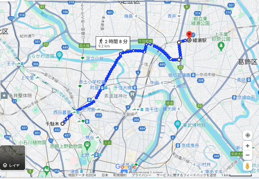 帰宅ランのコースですが、綾瀬駅までの約9kmを日課にしております。