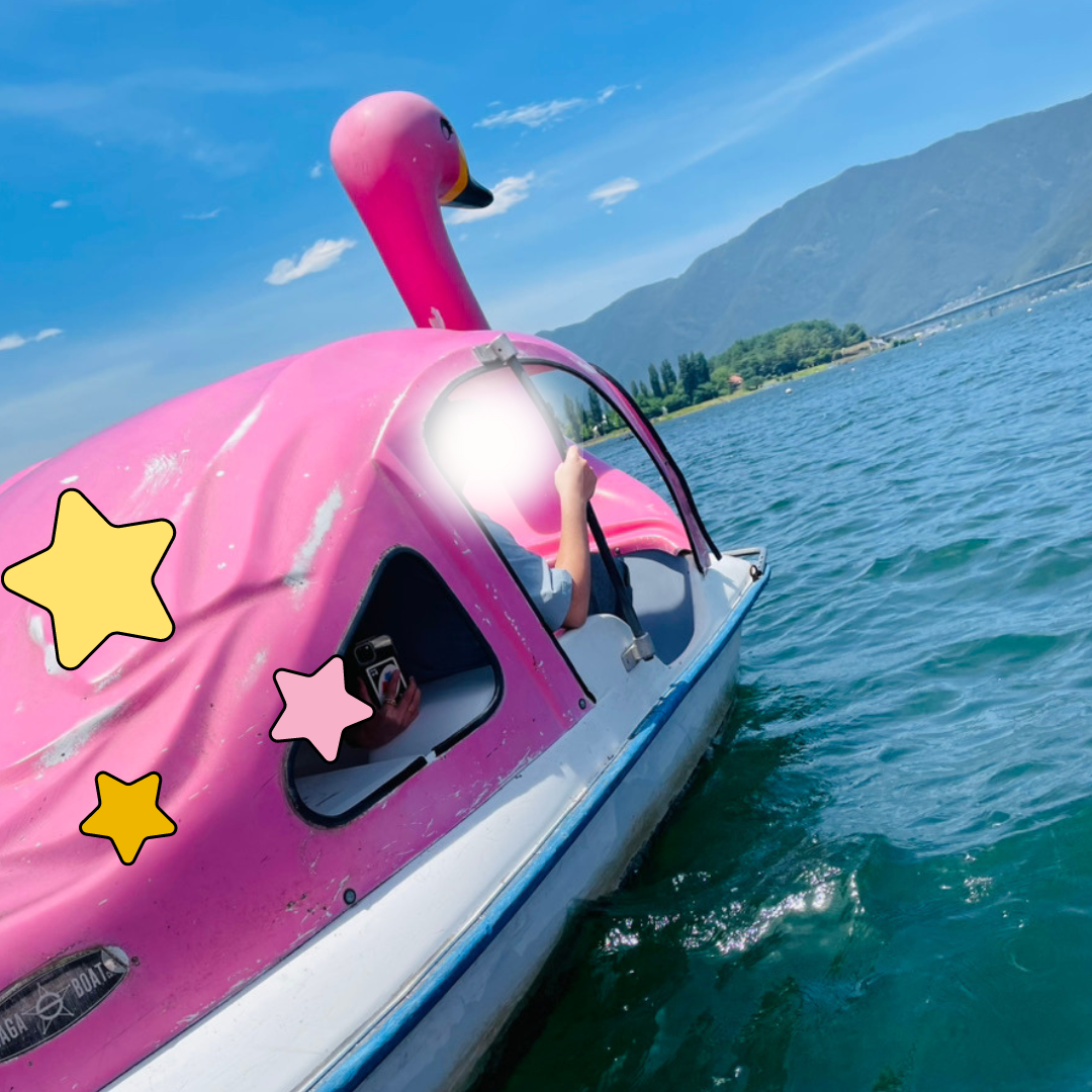 次の日はアヒルボートに乗って競争したりして、河口湖を満喫。
