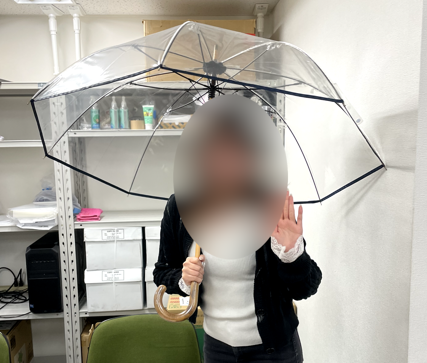 横では最高級ビニール傘を手に入れた社員を囲んで撮影会に