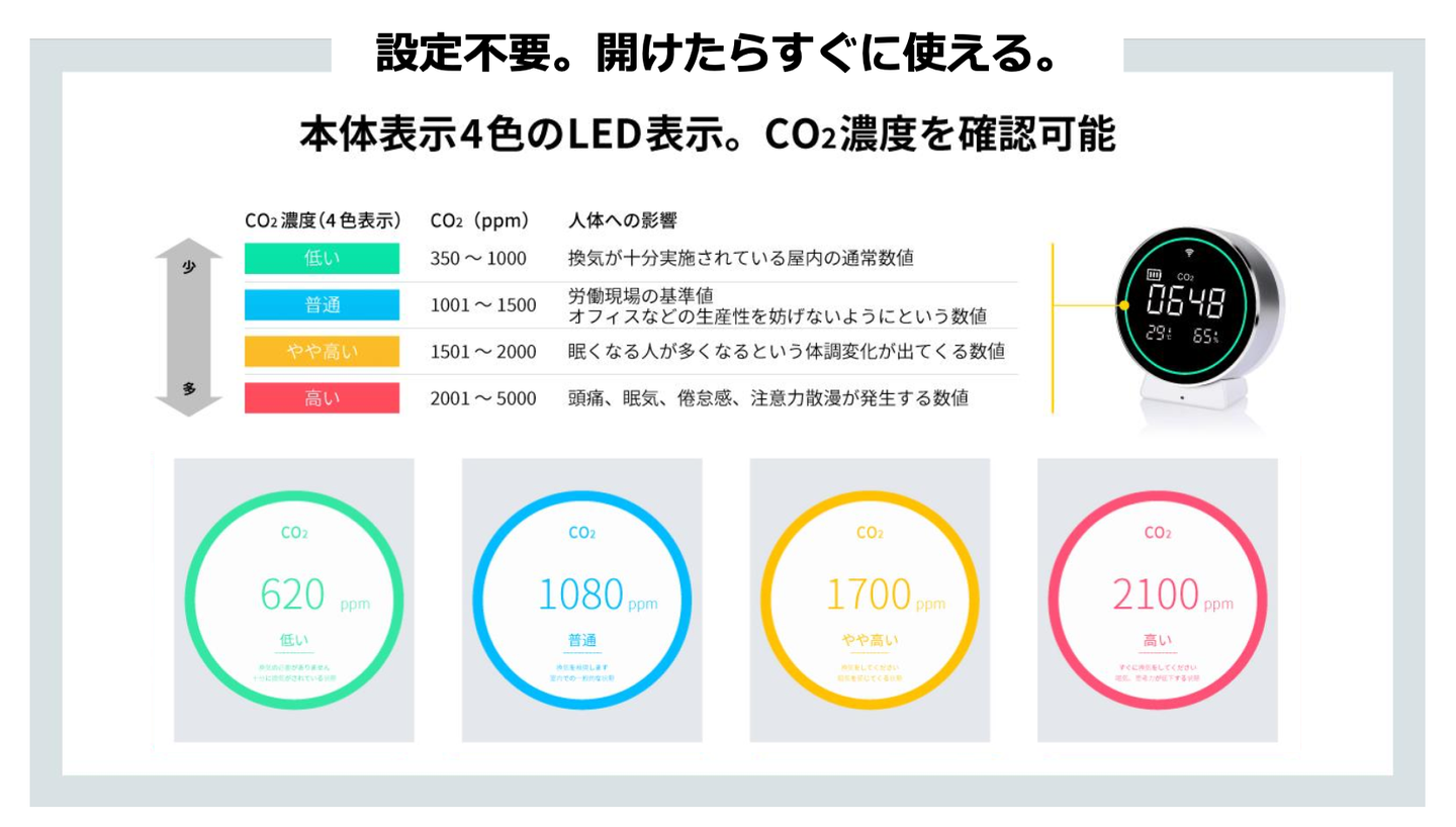 弊社のeAirは色で二酸化炭素の濃度が把握できるので、見やすく、わかりやすいです。