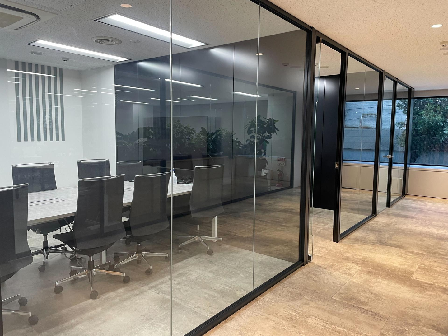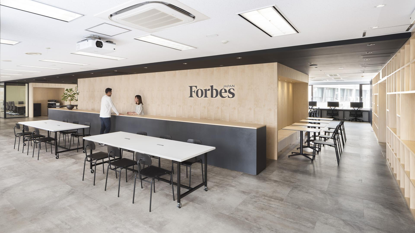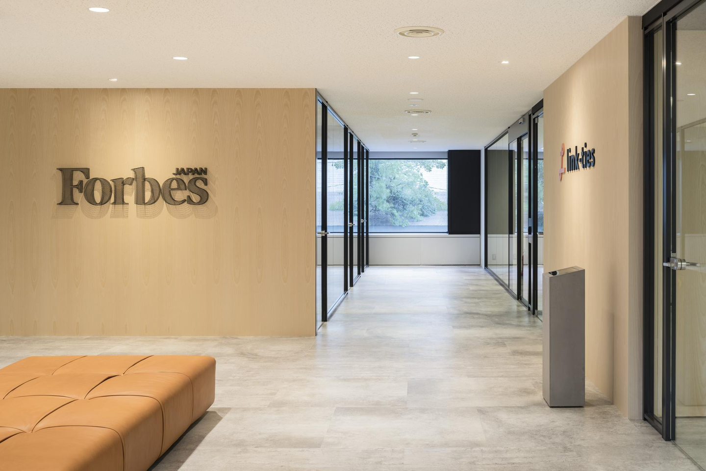 黒枠のガラス扉の向こうが執務室となっており、執務室の外側には会議室が4つ、執務室内にも会議室が1つございます。(少しわかりにくいのですが、会議室は以下の写真のちょうどForbes JAPANのロゴ側です!)