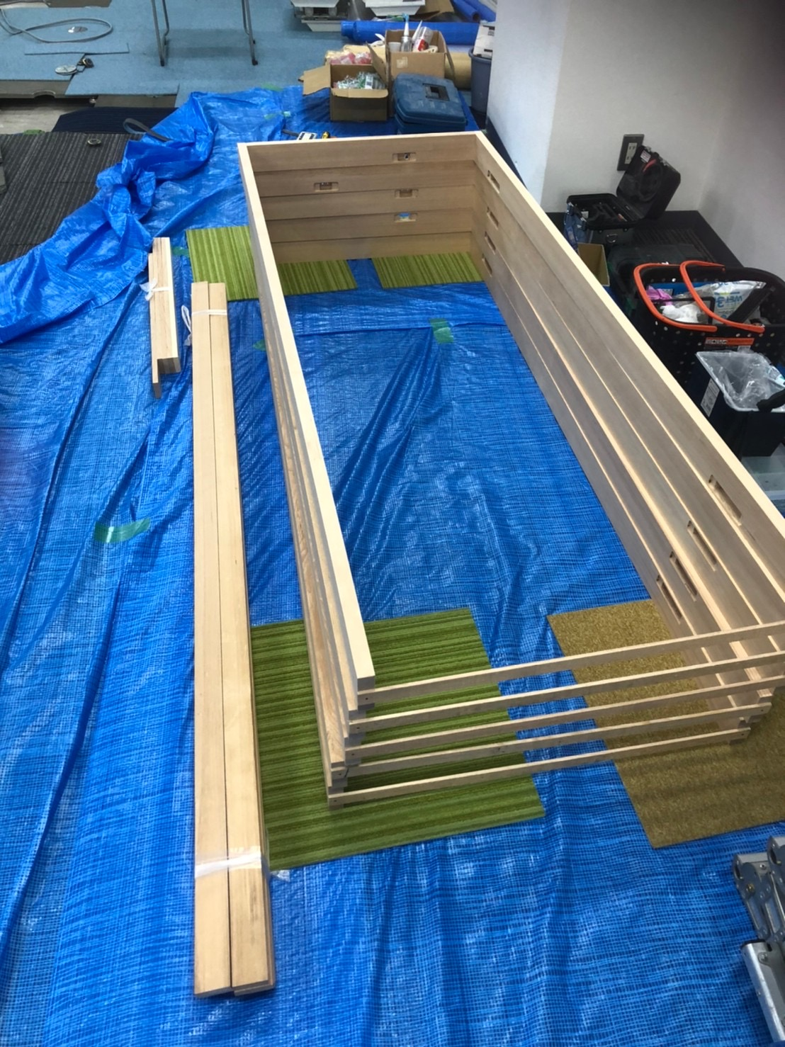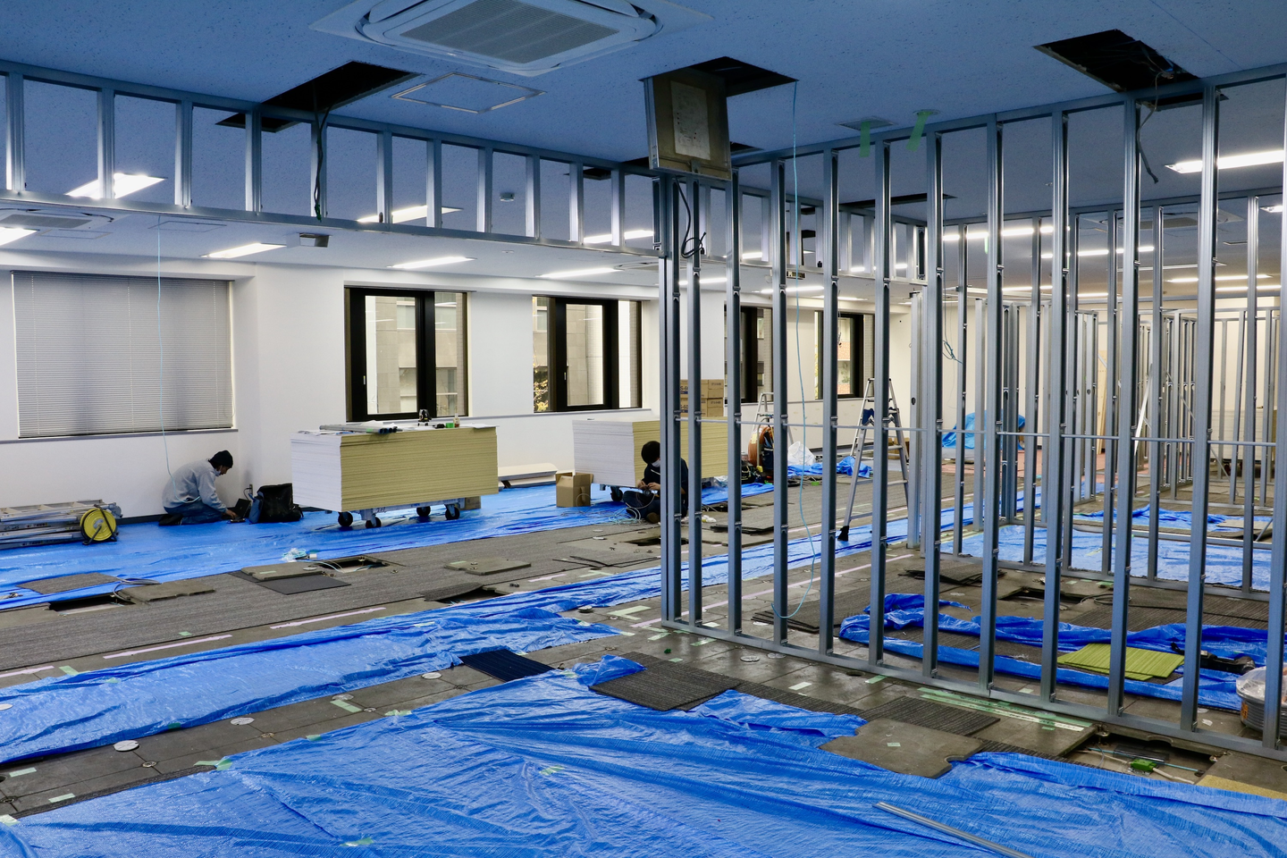 あっという間にビニールシートが貼られ、ステンレス格子のようなものが組み立てられました。位置的には会議室なので、壁の軸となる部分でしょうか。