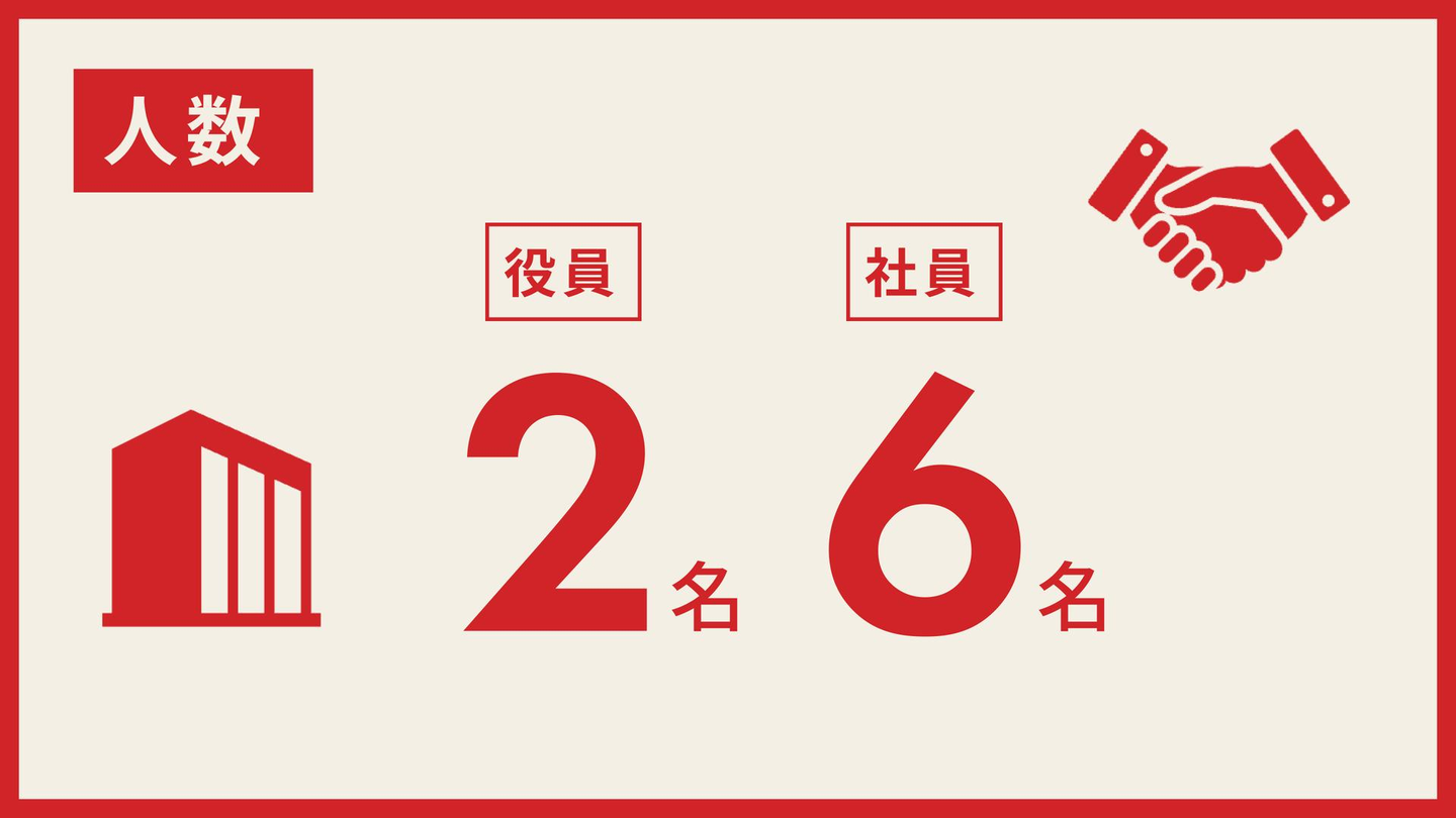 役員/社員数は、現在8名!少数精鋭でやってます!ちなみに、パートメンバーは5名ほど!