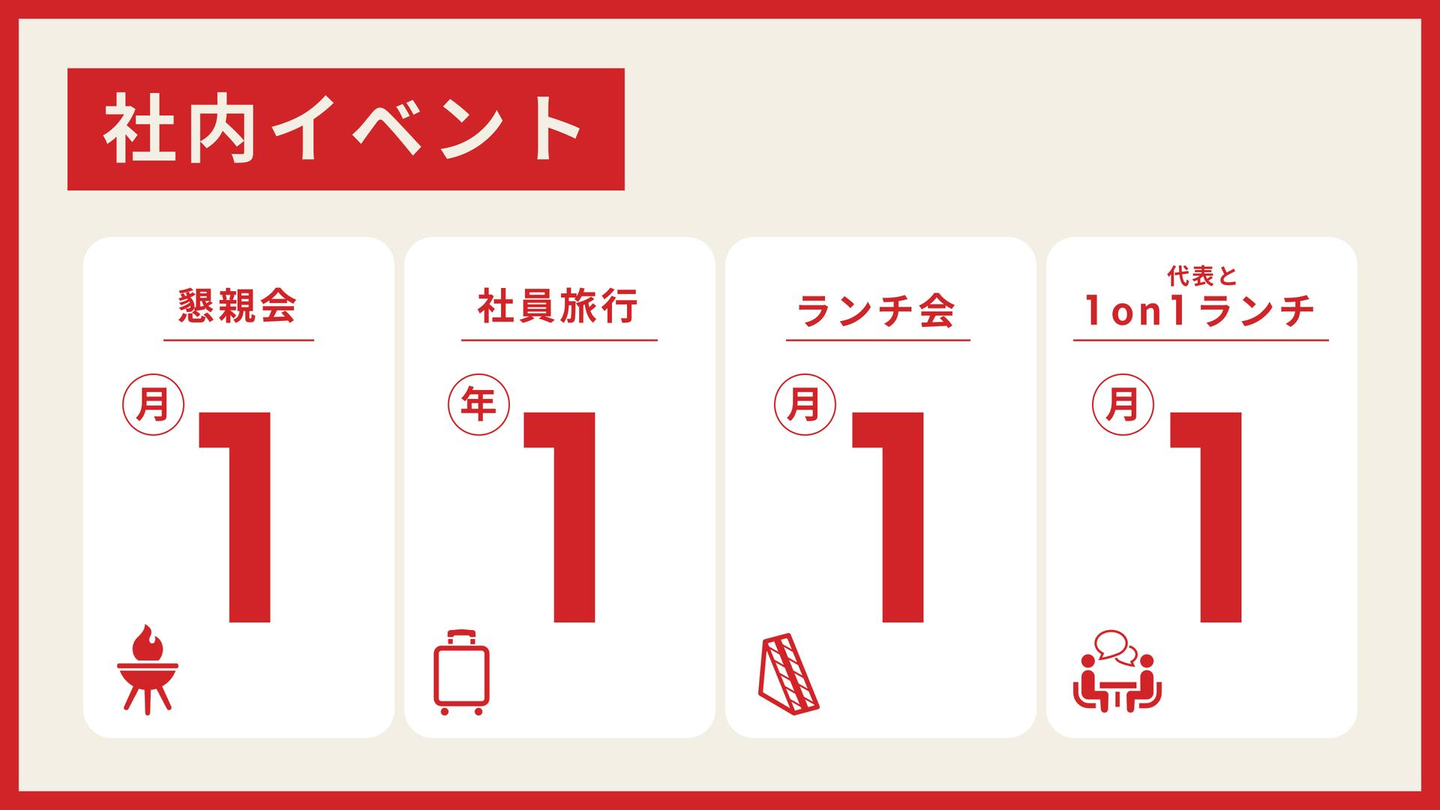 盛りだくさん!(笑)パートメンバー合同の懇親会もあります!代表との1on1ランチ(月1)も結構珍しいのではないでしょうか?仕事の話もプライベートの話も、カジュアルに相談できる環境は長く働く上でありがたいです。