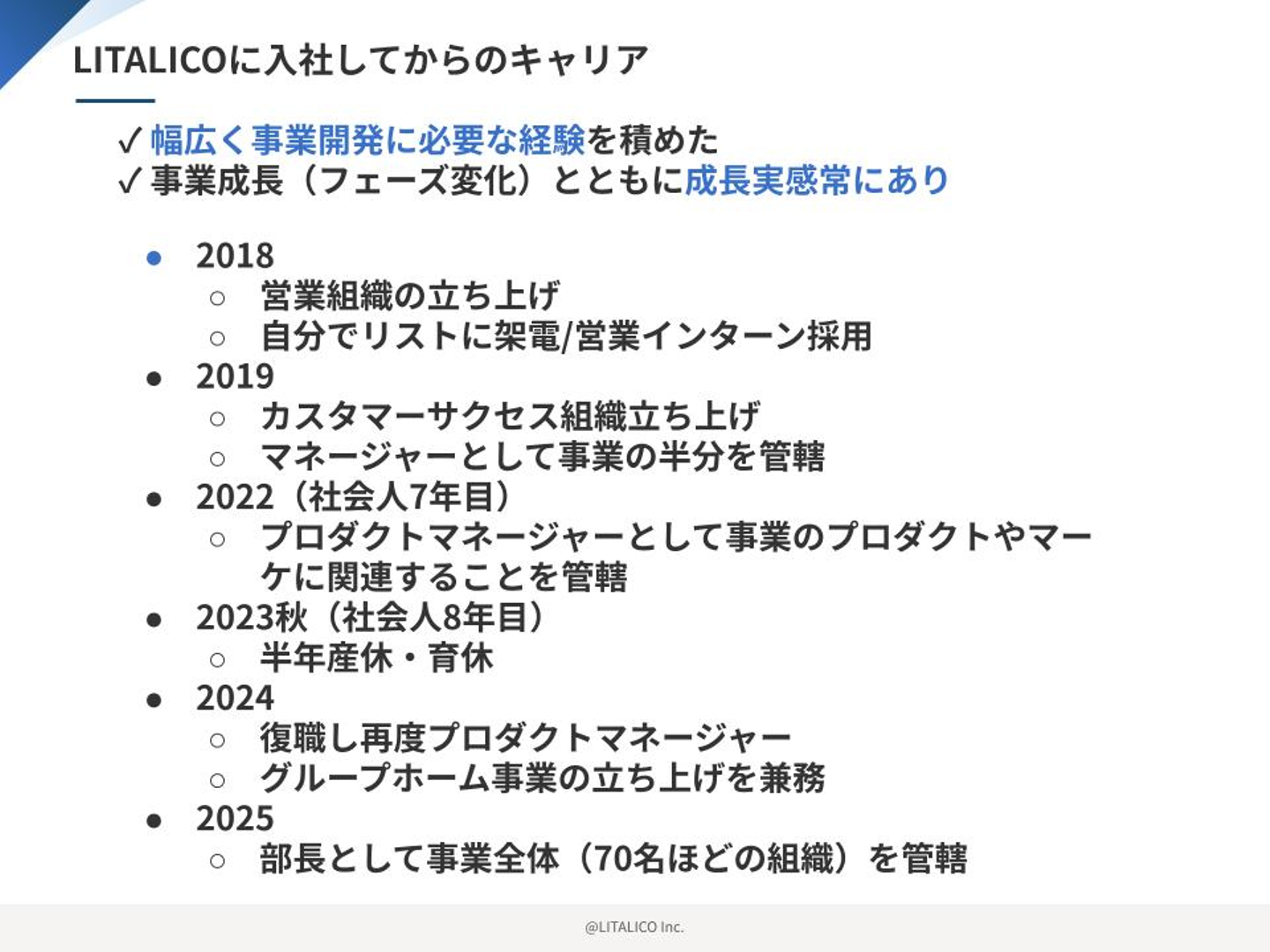 テレアポから始まり、事業のフェーズに応じて、CSチームの立ち上げやプロダクトマネジメントまで、「LITALICOキャリア」の成長に必要な役割を全て担ってきました。