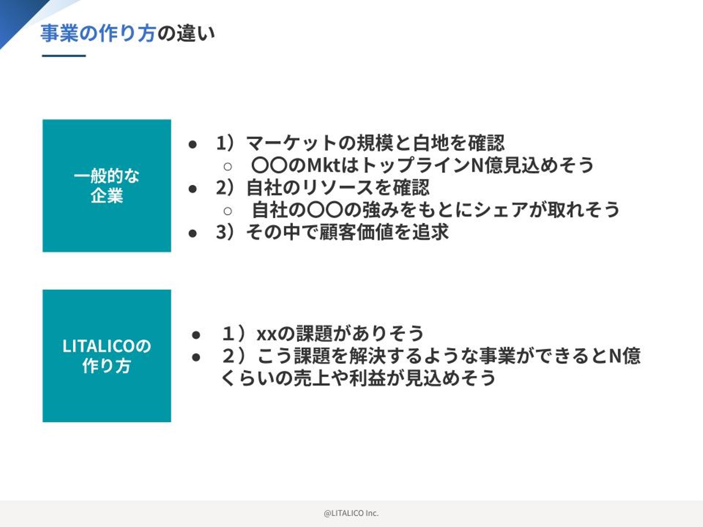 LITALICOの事業創造には、もう一つ特徴があります。それは、マーケット規模や収益性からではなく、社会課題を起点に事業を構想する点です。