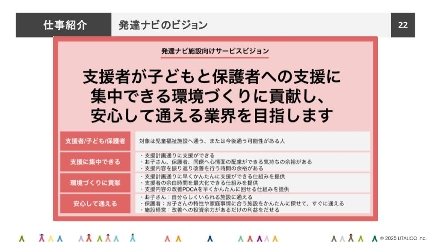 「発達ナビのビジョンは『支援者が子どもと保護者への支援に集中できる環境をつくり、安心して通える業界を目指す』こと。施設スタッフの方にサービスを届けることで、間接的にお子さまや保護者の方への支援の質を高めることを目指しています」