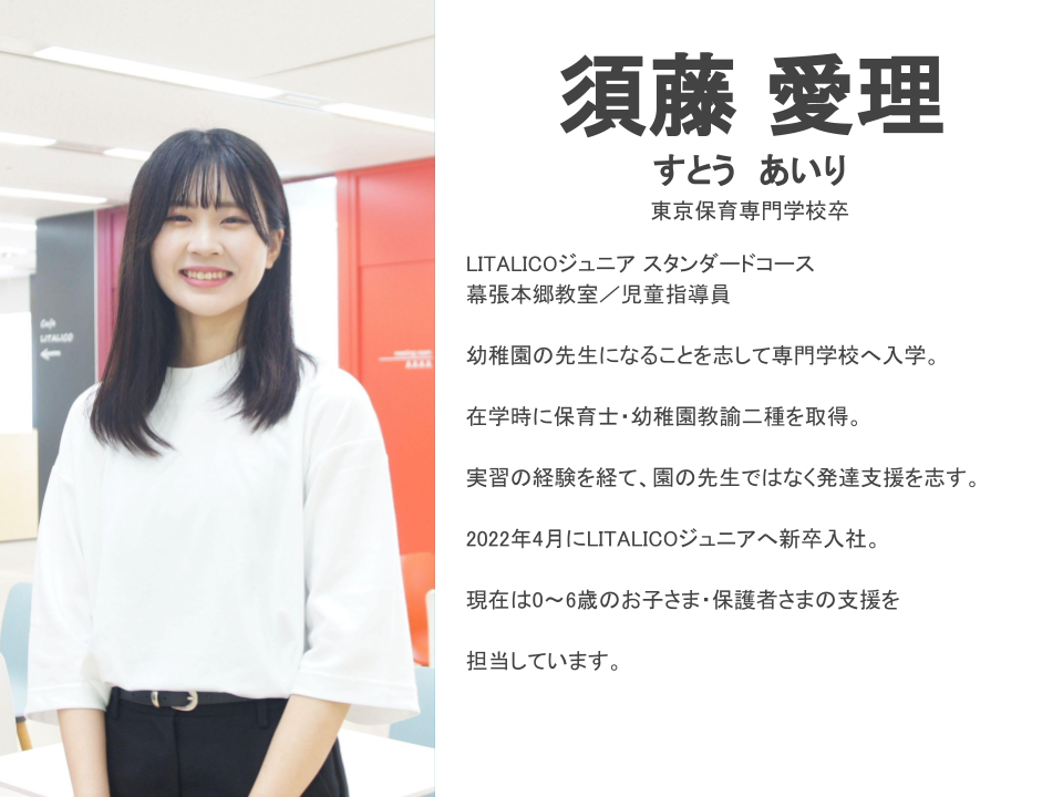 須藤愛理(以下、須藤):2023年4月に入社して児童指導員として働いています。幼稚園教諭を目指していましたが、学生時代に受けた実習での体験がきっかけとなり、発達が気になるお子さま向けの支援がしたいと感じてLITALICOに入社しました。