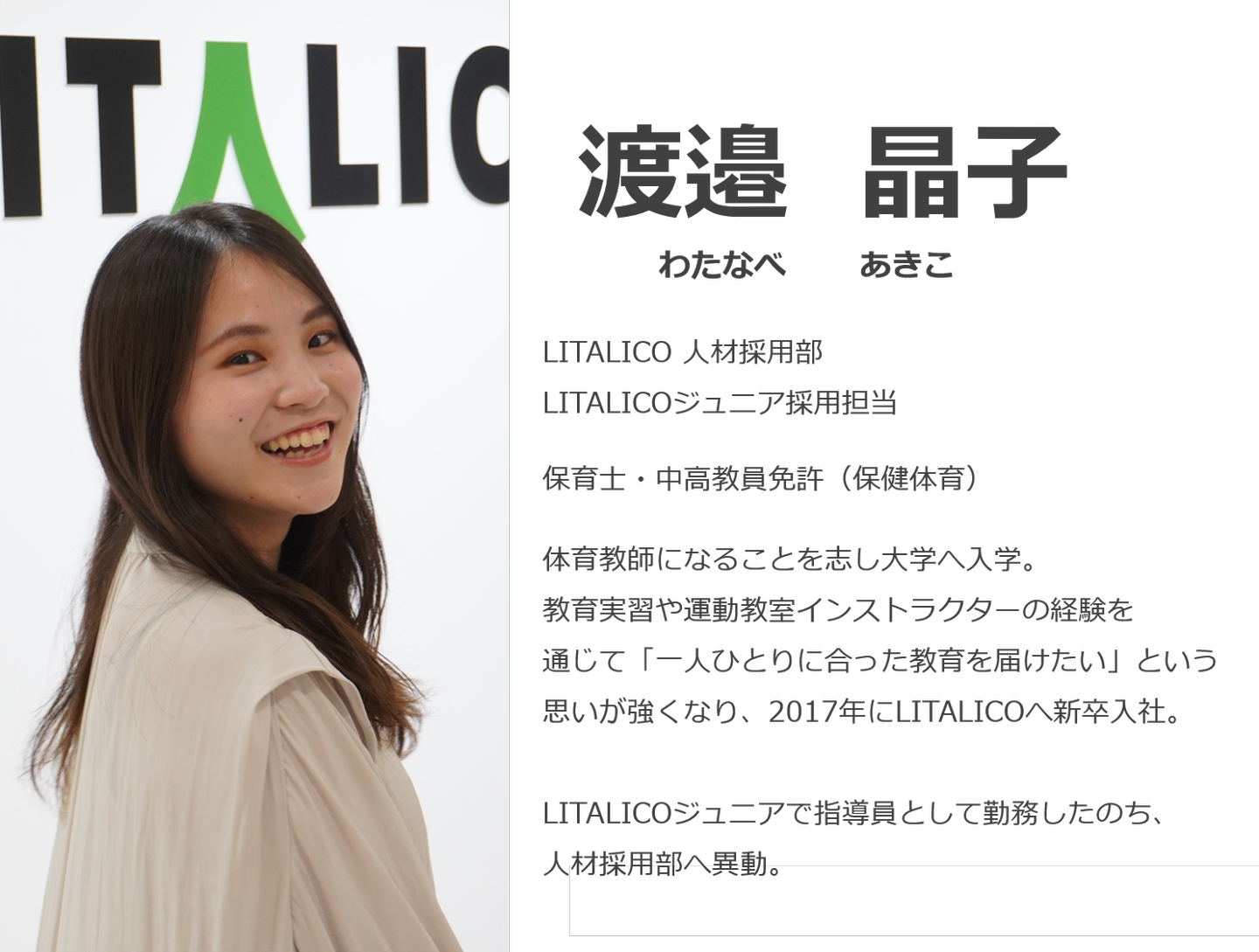渡邉晶子(以下、渡邉):今日はファシリテーターとして須藤さんに質問を投げかけていきます。よろしくお願いします。私ももともと教師を目指していたんですが、実習で自分のやりたい教育ができるのか疑問に感じて。LITALICOでは自分の目指す個別最適な教育ができると感じて入社しました。現在は採用担当としてはたらいています!