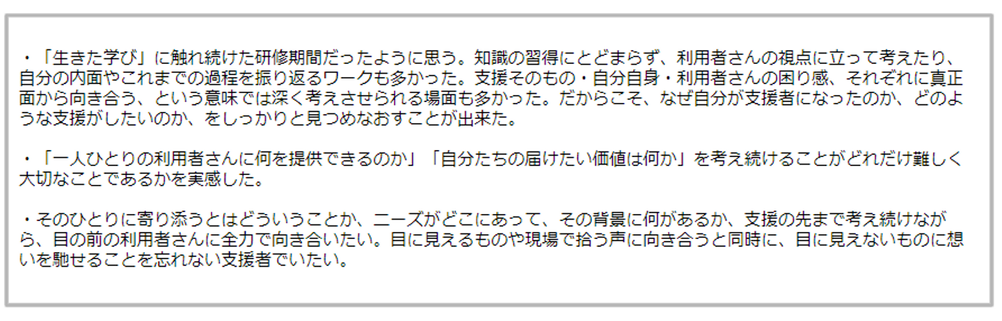 知識を得ただけで急に支援者として利用者さんの対応や実践に至るのはハードルが高いと考えており、研修の中で小さな成功体験をたくさん得て貰いたいという背景のもとです。
