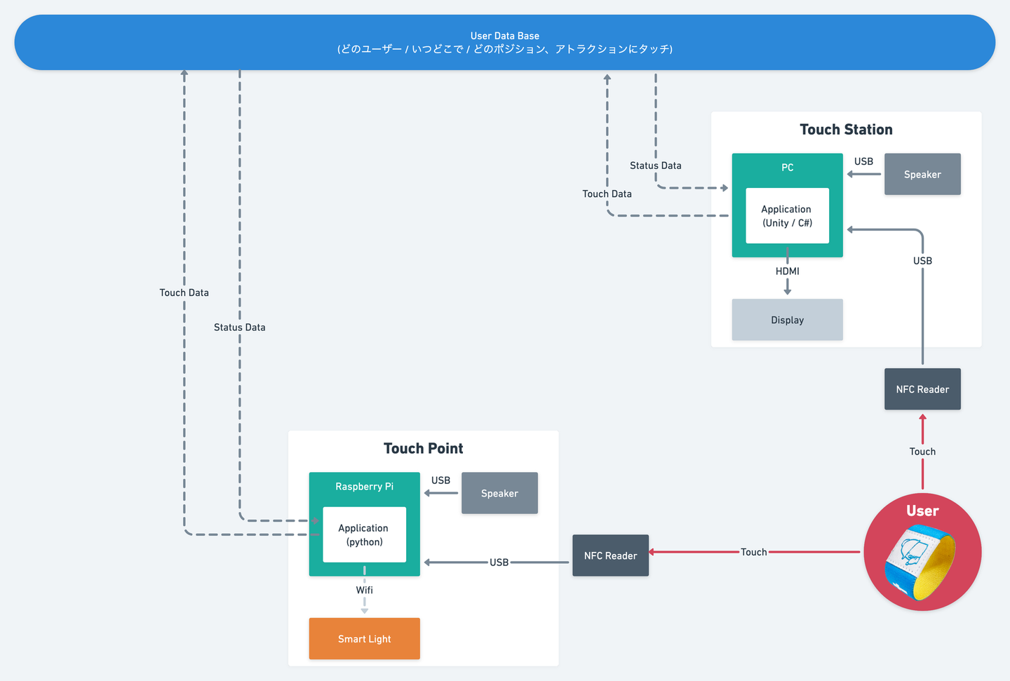 Raspberry PiからNFCリーダーやキノコ型のライトの点灯やスピーカーを制御したり、各データベースとの連携を行っています。