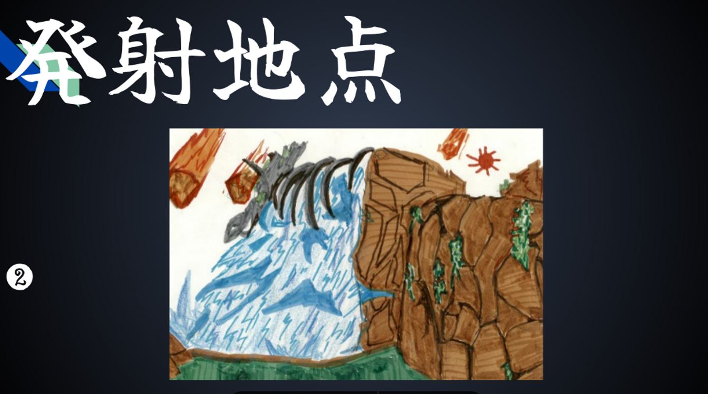 発射地点をここにした理由を説明します。まず山があると、どこらへんの高さから発射するのかが分かりやすいと思ったからです。滝を入れた理由は、自然のあるところから発射させたいのでここにしました。隕石を入れた理由は、これから宇宙に行くんだぞという雰囲気を出すために入れました。