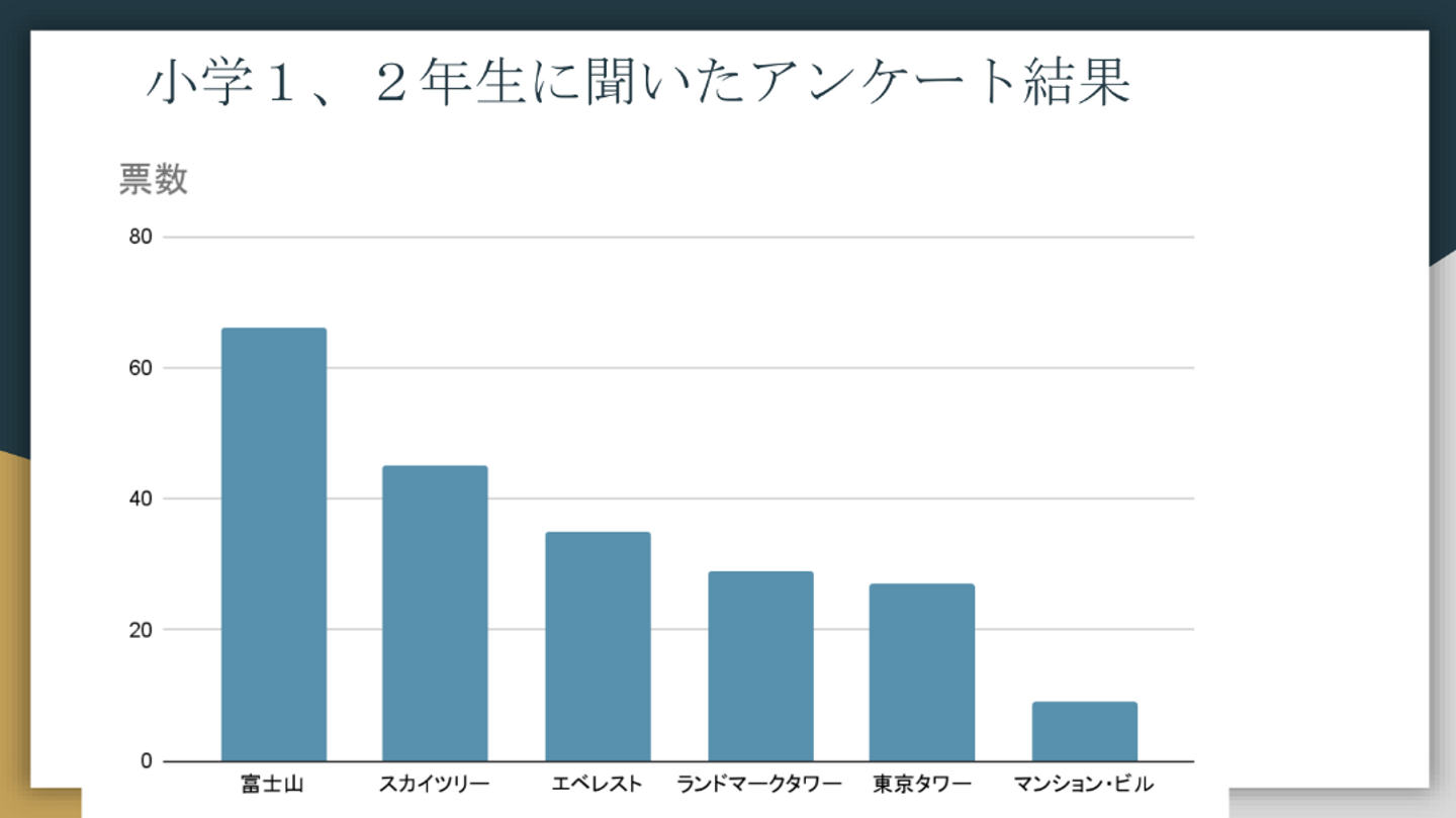小学1-2年生でもイメージしやすいように、高さを表す背景(建物や山)のアンケートを取っていたグループも!他にも上空何メートルを飛んでいる鳥などを調べ、背景のどの位置に配置するか、などをレポートにまとめていたグループもありました。