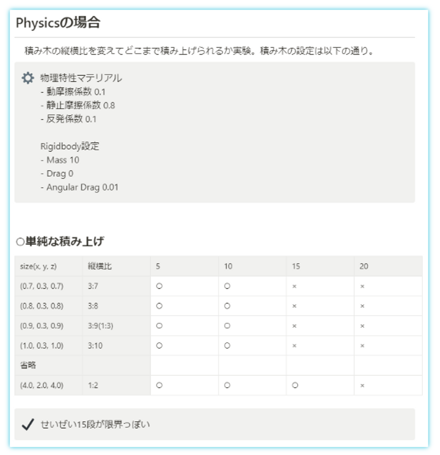 アトラクション画面に映る最低限の下から8個を実際のだるまとしてシミュレーションし、上のだるまはダミーとすることにしました。これで積み上げることは解決したのですが、次なる課題はバランスでした。