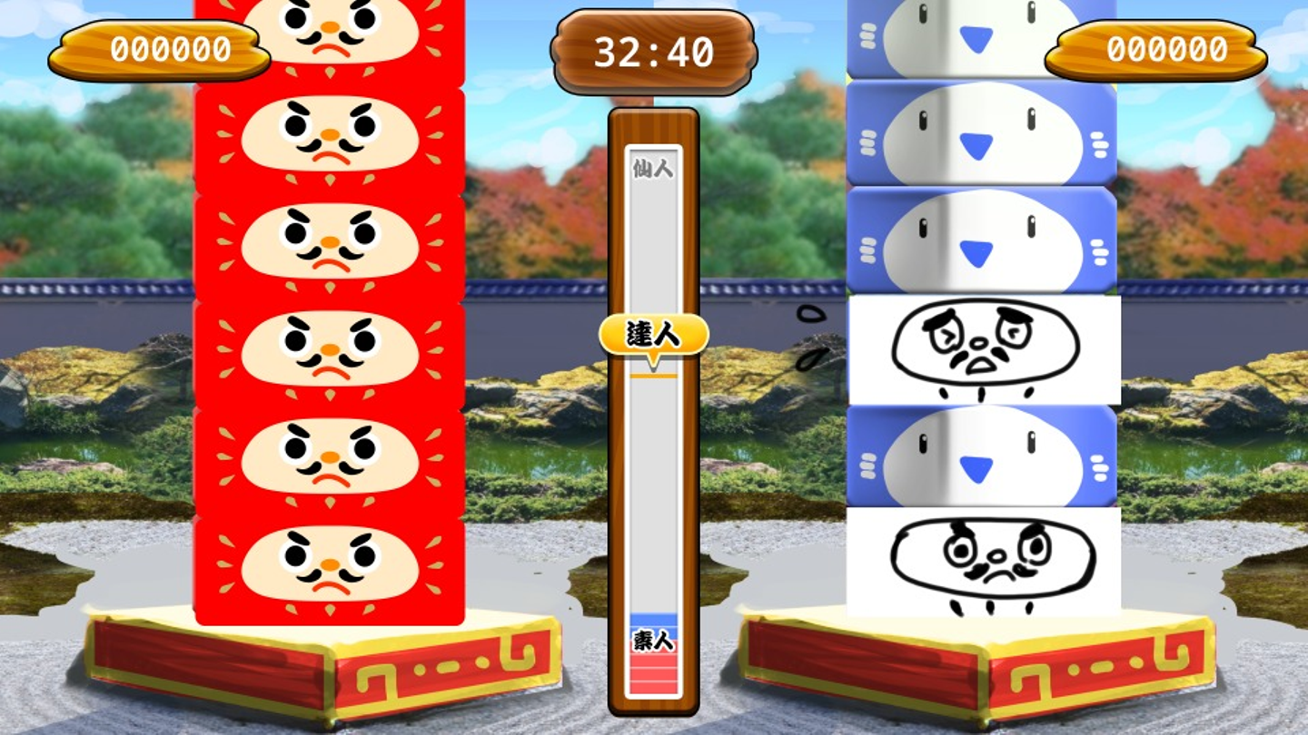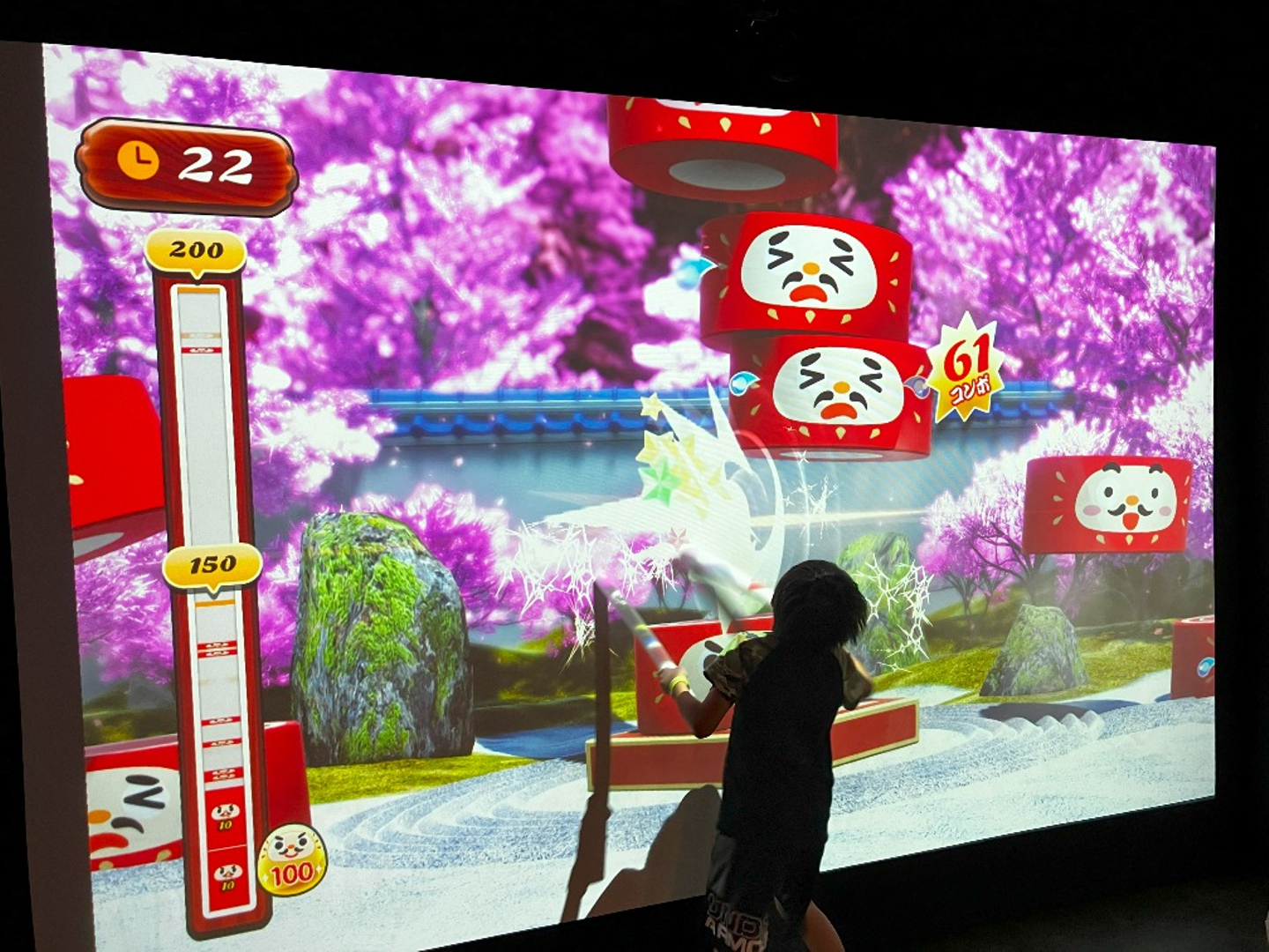 「DARUMA INFINITY/無限だるま落とし」は、高く高く積み上げられた「だるま」を専用スティックで打ち落としていき、打ち落とせただるまの数を競うアトラクションです。
