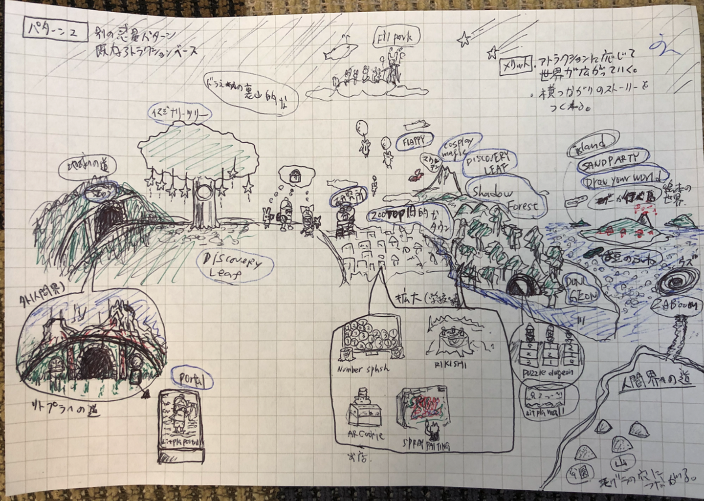 また、アトラクションの企画については、映像制作にも近いかもしれません。絵コンテのように自分が表現したいイメージを体験イメージとして時系列に描きます。そこに「遊び」の要素が入ってきますので分岐が入ったり、インタラクション要素を加えていきます。