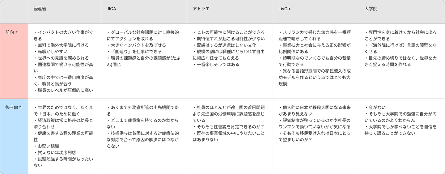 経産省からベンチャーまで、悩みに悩みました。写真のように選択肢それぞれのメリット・デメリットを整理したりもしましたが、だからと言って進むべき道が分かることもなく悶々としていました。