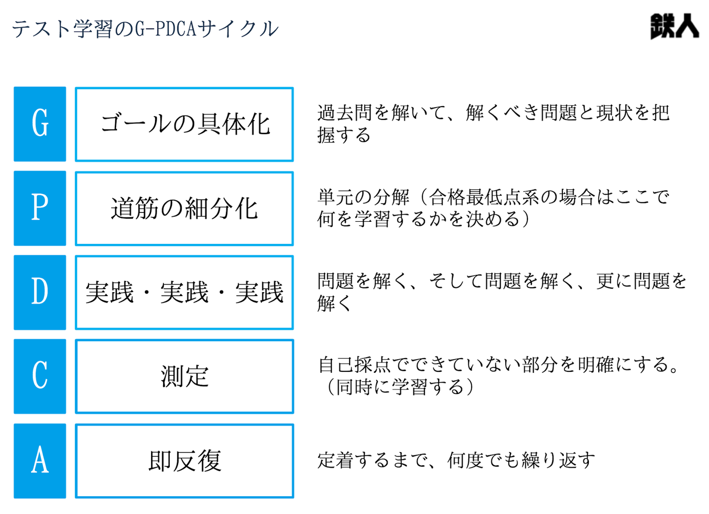 本日の講義メインテーマは「テストの学習方法」。ビジネスの現場でよく使われるPDCAサイクルの頭にG(=ゴール)をつけた“GPDCA”のフレームを使い、テスト勉強に最適な学び方が解説されていきます。