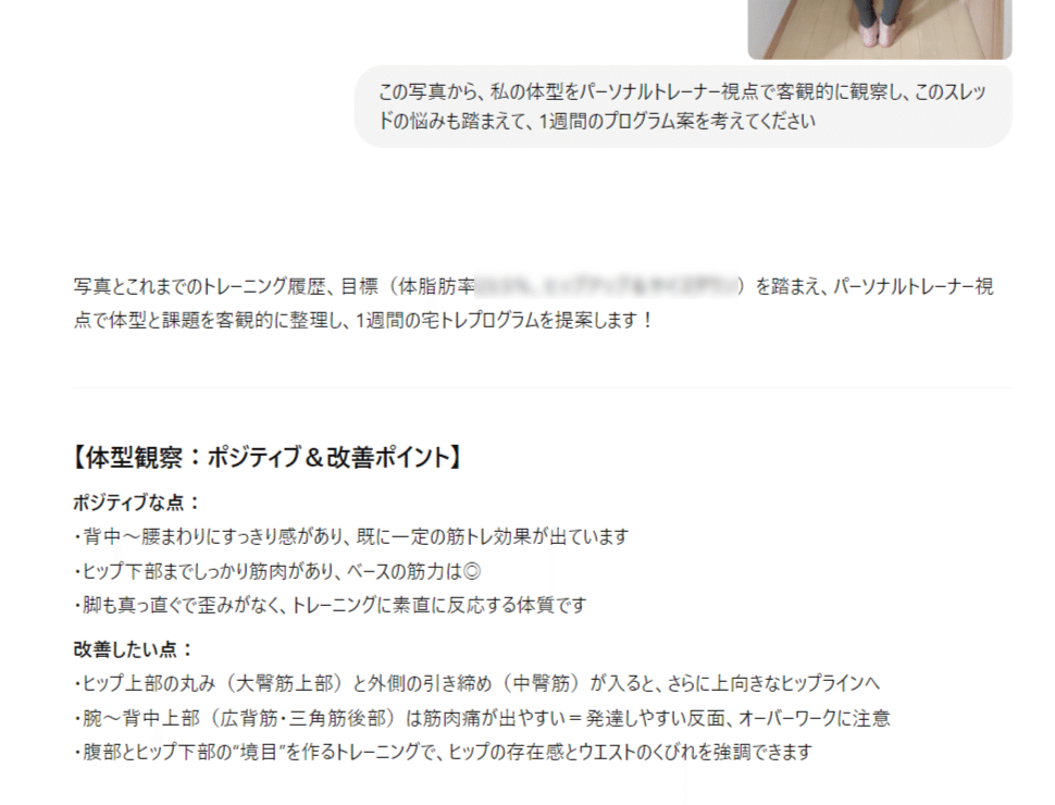 AIパーソナルトレーナーのプロンプトと体型観察結果