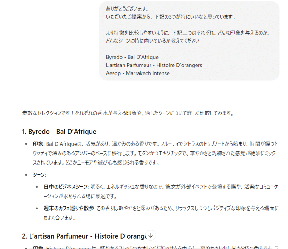 私の性格や、どんなシーンに合わせたいかを伝えると、香水のブランド名+具体的商品まで提案してくれます。