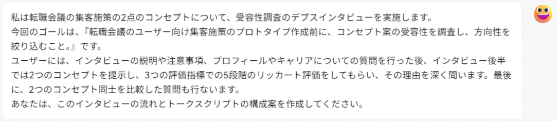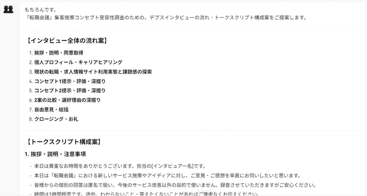 ユーザーインタビューのスクリプトを、AIと一緒にたたき台を作成。最初の取り掛かりのハードルを下げてくれたり、意外な視点をくれることが多々あります。