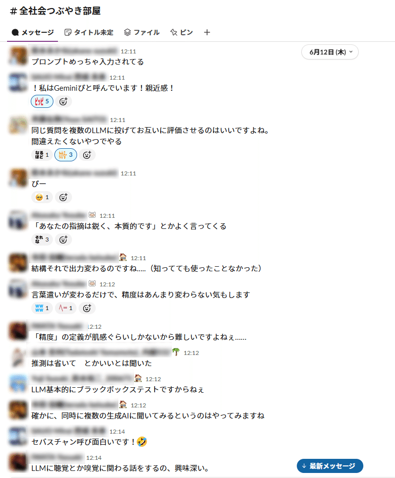 社内勉強会の名物でもあるSlackの実況チャンネル#全社会つぶやき部屋には、今回もリアルタイムで反応や疑問、笑い声が流れ込み、いい意味で“勉強会らしくない”にぎわいがありました。