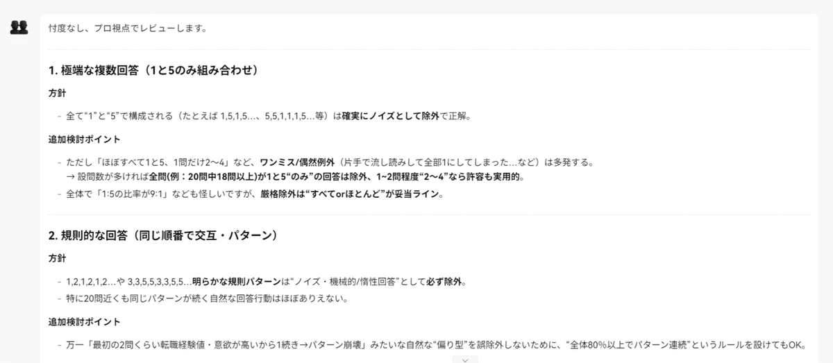 調査票の文言レビューや、調査の集計時に除去するノイズ回答定義のレビューなど、問いが曖昧なときには、意図を再言語化してくれたり、観点が足りないときには補ってくれて、常に心強い相棒として活用できます。