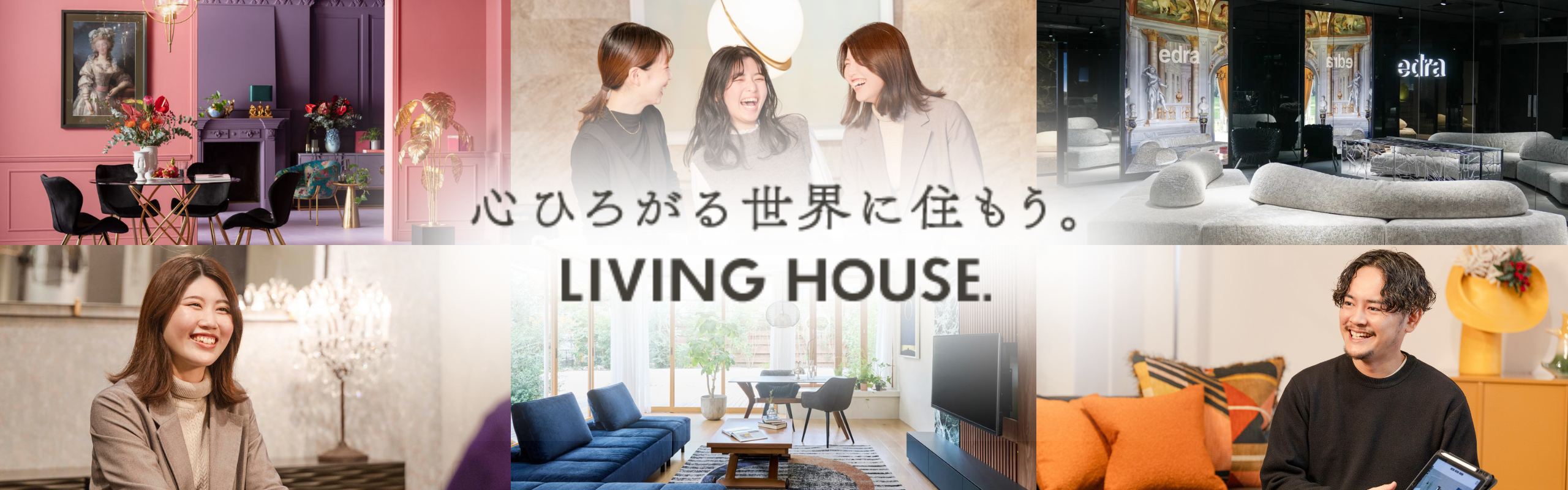 リビングハウスは「人財」「商品力」「お買い場体験」を強みとして、「多店舗展開」「OMO」「新規事業」を時代や市場ニーズに合わせ、 ” 環境適応 ” しながら、事業拡大を続けています。 インテリアを通じて空間の価値が高まり、そこで過ごす時間の価値がわたしたちの日常・非日常を彩り、心を豊かにし、家庭も社会も豊かになっていく。 未知を楽しめる生き方を増やし、多様な価値観が共生できる世界をつくるために、「心ひろがる世界に住もう。」をコンセプトに掲げ、日本の空間時間価値の向上をミッションに展開してまいります。