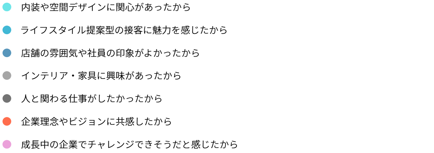 志望動機を見てみると、インテリアや空間デザインへの関心だけでなく、接客や人との関わり、さらには企業理念への共感など、本当に様々な理由で応募いただいていることがわかりました✨