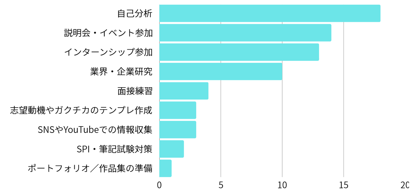 上のグラフを見て分かるように、自己分析を積極的に行うことはもちろん、会社説明会やインターンシップへ実際に参加しながら、自分自身や業界・職種についての研究・分析を深めることが重要だと多くの人が感じたようですね!