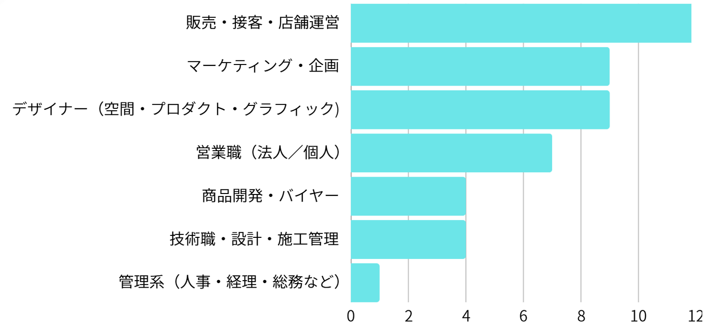 職種は「販売・接客・店舗運営」が最も多く、「マーケティング・企画」や「デザイナー」といったクリエイティブ職が次に多い結果となりました!