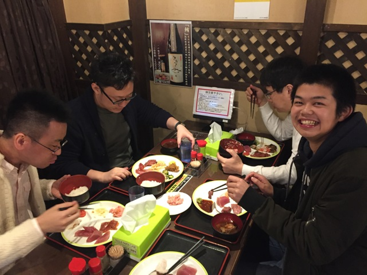 築地の刺し身が食べ放題のお店でランチしたり、宿泊所のキッチンでステーキ肉を大量に焼いてたらふく食べたりしました。