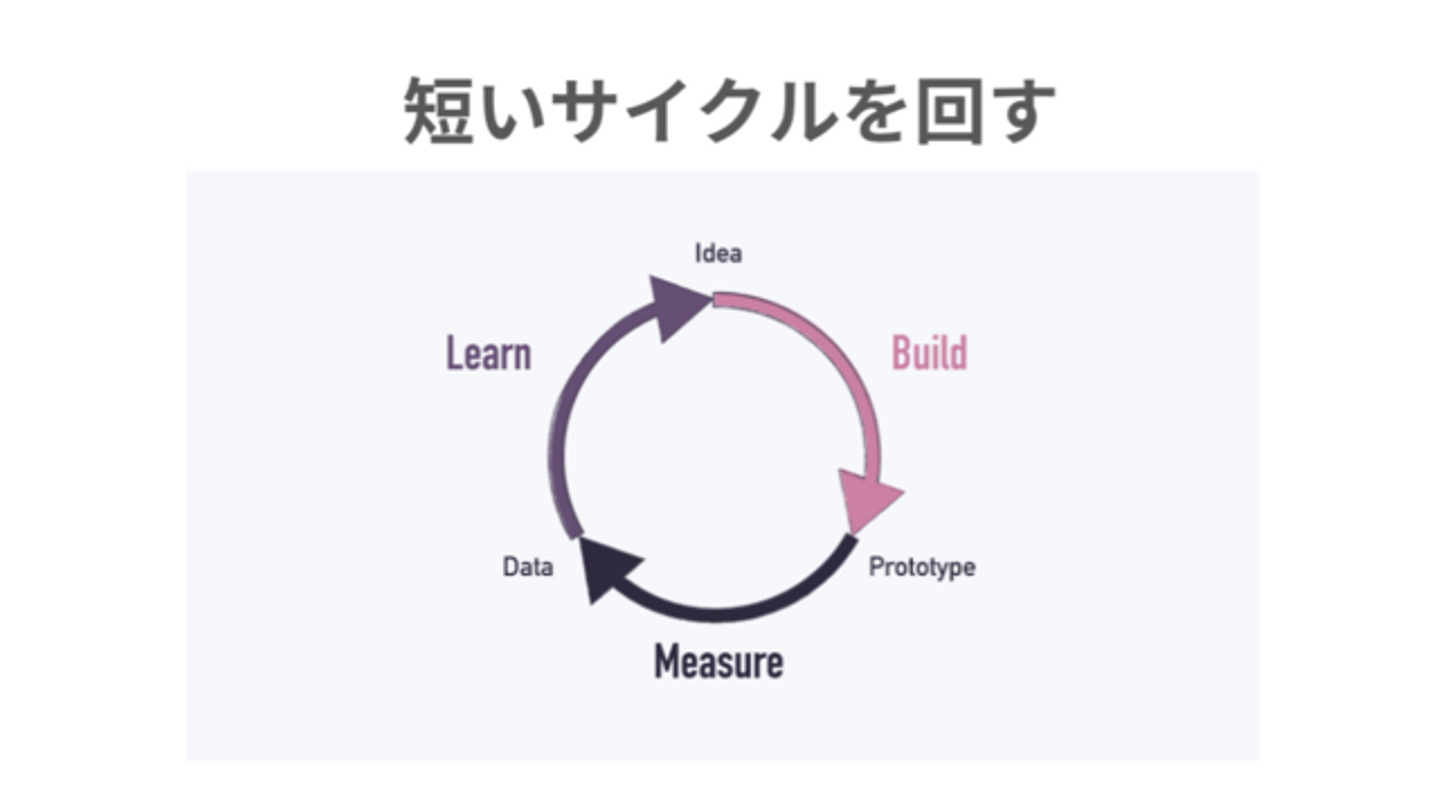 整理したものを検証をするために、リーンスタートアップの方法論を用いて、効率的にbuild(構築)-measure(測定)-learn(学習)のサイクルを回していきます。