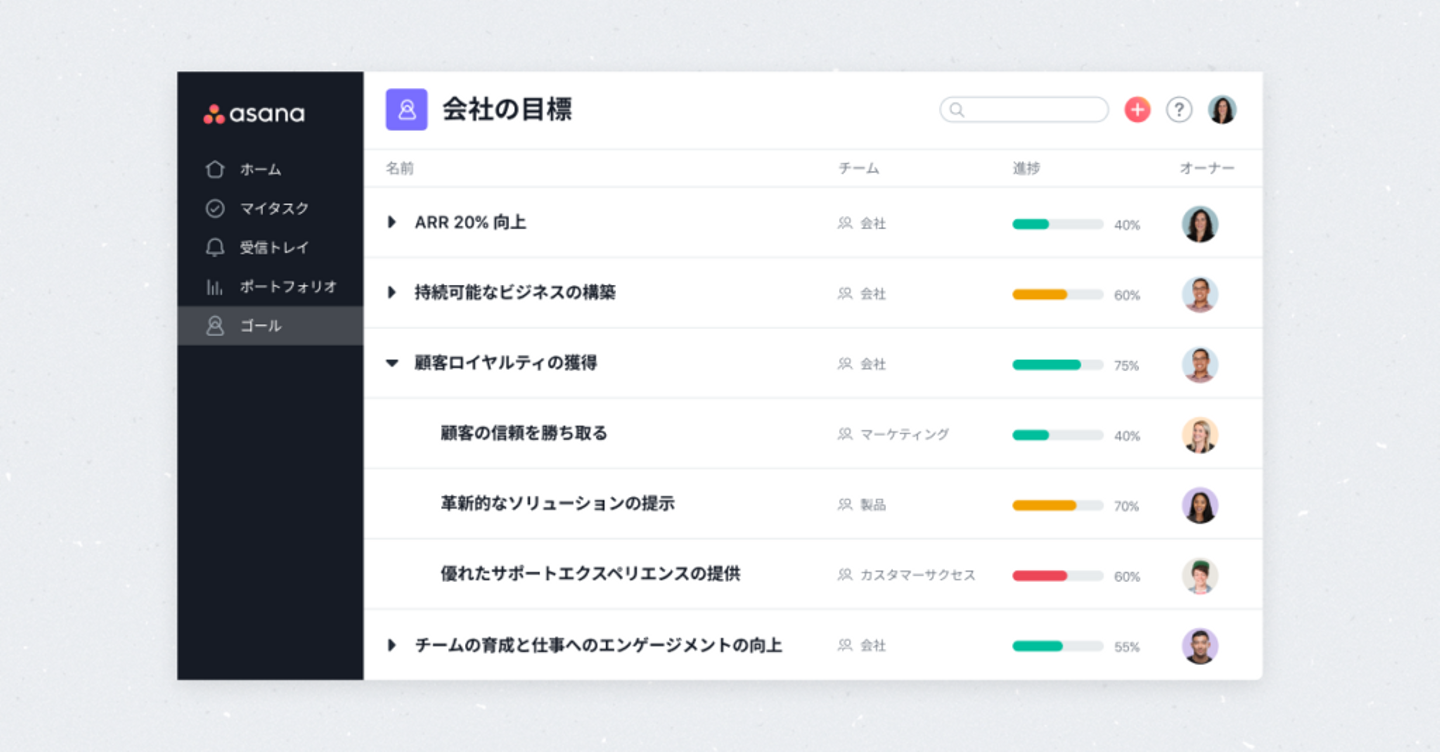 asanaはOKR形式の進捗管理をベースとして設計されています。