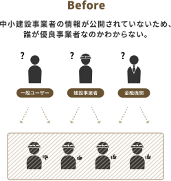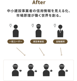 この課題は個人だけではなく、施工業者の間でも発生します。建設業界だと、ある業者がクライアントから受けた仕事を別の業者に発注すること(いわゆる元請・下請け)はよくありますが、業者の情報が開示されていないため、「信頼できるあの業者に頼もう」といったことができないのです。