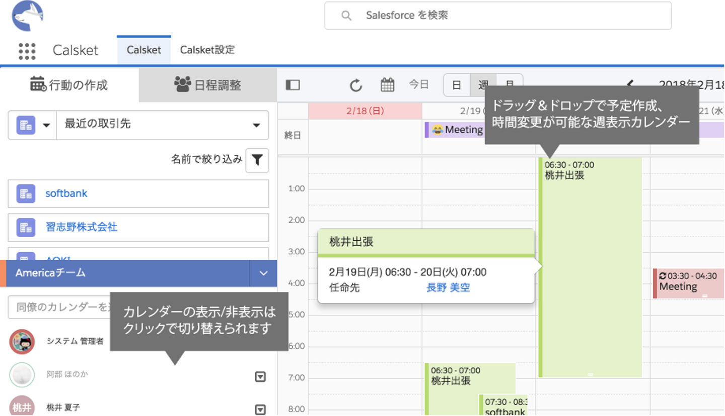 Calsketのカレンダーは、一般的な日、週、月の標準的なマルチユーザーカレンダーの操作性も高く、取引先や商談、参加メンバーを効率的に追加することが出来ます。頻繁に訪問する取引先や、活動中の商談をリスト表示し、ドラック&ドロップで行動を追加する機能も備わっており、Salesforce内の商談と紐づけて行動を管理することができるため、顧客との接触を管理するのも簡単です。非常に直観的に使うことができる点も大きな魅力です。