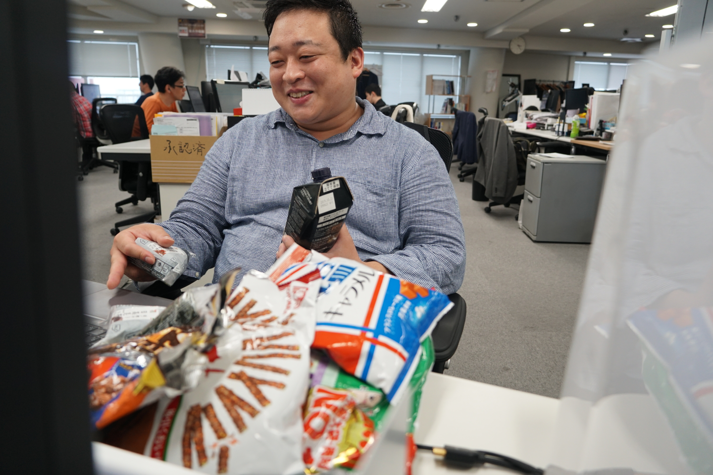 なんということでしょう。私の目の前に座っているプロデューサーのKさんが尋常でない量の食品をデスクに積み重ね、左手には紙パックコーヒー、右手にはオニギリを持ち、ご満悦の表情でPCを操作しているではありませんか。