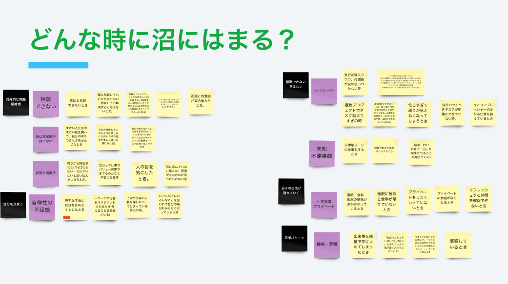 そして「どんな時に沼にはまりますか?」という質問では、誰かに相談できない時や、相談の仕方が分からない時、そしてキャパオーバーや、未知の領域にチャレンジする時などの回答も。その結果、睡眠不足やリフレッシュする時間がとれないという意見もあり、小さなネガティブの連鎖が沼を発生させているパターンが見えてきました。