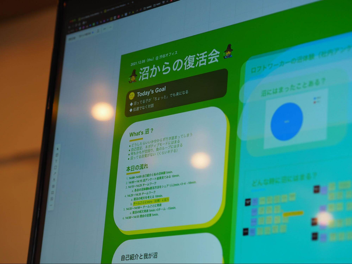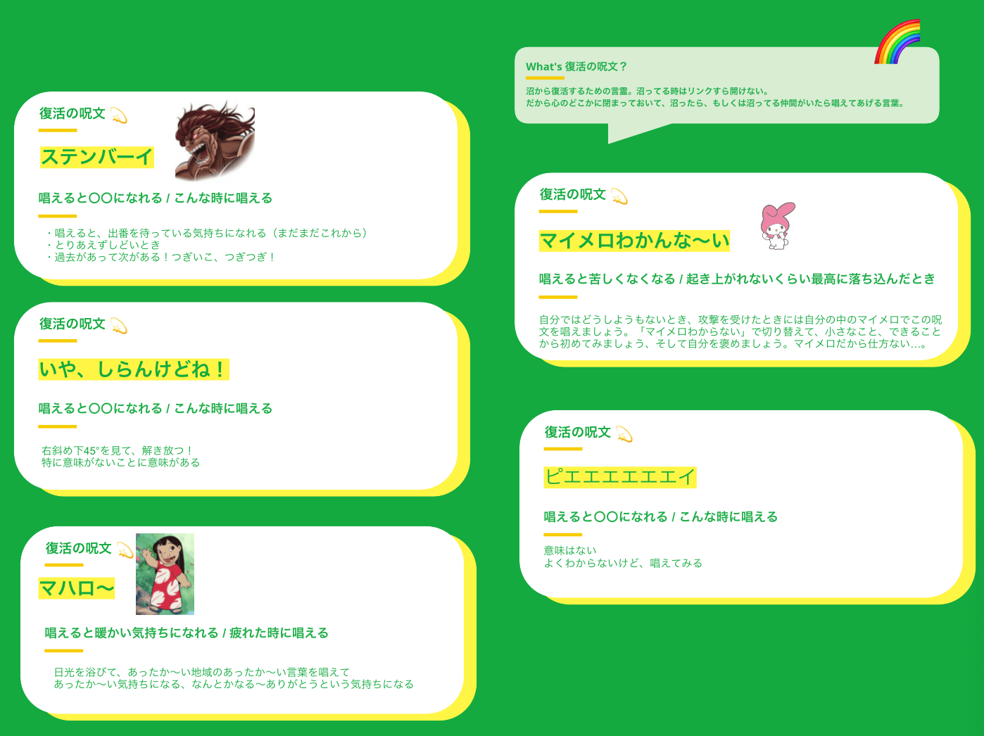 後半では少人数のチームに分かれ、それぞれの沼体験や復活方法をシェア。問題解決やコーチングを目的とせず、フラットな関係で、お互いに弱音を吐きあう時間は予想以上に心を軽くするものでした。ただそれだけで終わらないのが私の復活会。チームごとに「復活の呪文」を考え、それぞれ発表してもらいました。ふざけているように見えるかもしれませんが、ここには沼経験者である私の強い想いがあったのです。というのも、本当に沼にはまったときは、目の前のこと以外に興味をもつことや、果てはリンクをクリックする力すら湧きません。そんなときに、いつでも唱えられる呪文という言霊を頭の片隅においておき、少しでも心を楽にしてほしいと考えたのです。